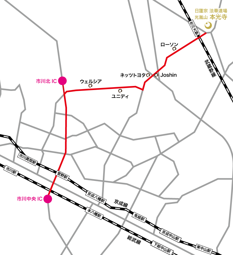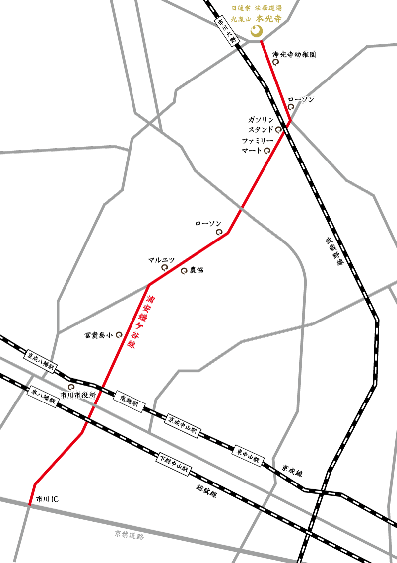 最寄りの駅はJR武蔵野線の市川大野駅です。改札口を出ましたら、目の前に走っている幹線道路を左の方へお進みください。徒歩3分で本光寺に到着します。尚、市川大野駅には改札口は一箇所しかありません。
